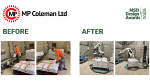 MP Coleman Ltd, a civil engineering and materials company, won the main award. Workers were manually palletising 25kg bags — each handling around 5 tonnes of material per shift — involving repetitive bending and twisting that caused lower back fatigue and shoulder discomfort. A robotic arm now picks, places and stacks the bags automatically, with an automatic wrapping unit replacing manual stretch wrapping entirely. Perimeter guarding (not shown in the photos)) and automated controls improve safety and simplify the workflow.
